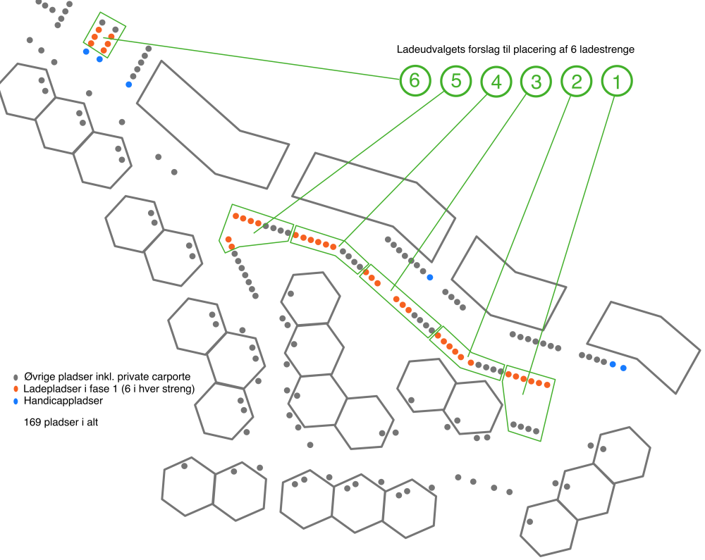 Ladeudvalgets udkast til placering af 6 ladestrenge med hver 6 ladeudtag